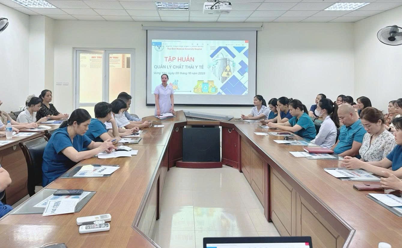 Nhằm tăng cường công tác kiểm soát nhiễm khuẩn, đảm bảo an toàn cho người bệnh, nhân viên y tế và bảo vệ môi trường, chiều ngày 09/10/2025, Bệnh viện Đại học Y Thái Bình đã tổ chức lớp tập huấn “Quản lý chất thải y tế năm 2025” cho toàn thể viên chức và người lao động đang công tác tại Bệnh viện.
