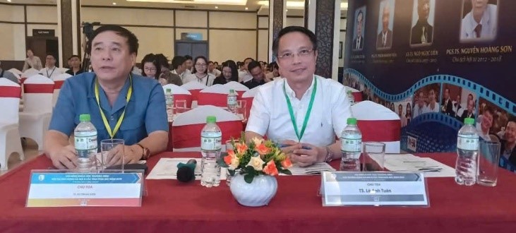 (NGƯT.PGS.TS.BS Ngô Thanh Bình và TTND.TS.BS Vũ Trung Kiên Đoàn đại biểu Bệnh viện Đại học Y Thái Bình tham gia chủ tọa đoàn tại Hội nghị)