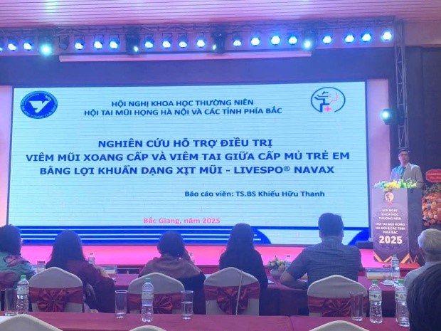 Đặc biệt, báo cáo đề tài “Nghiên cứu hỗ trợ điều trị viêm mũi xoang cấp và viêm tai giữa cấp mủ ở trẻ em bằng lợi khuẩn dạng xịt mũi – Livespo Navax” đã thu hút sự quan tâm của các bác sĩ dự Hội nghị. Nghiên cứu được thực hiện tiên phong tại Bệnh viện Đại học Y Thái Bình, đánh dấu bước tiến quan trọng trong việc ứng dụng lợi khuẩn dạng xịt mũi để hỗ trợ điều trị viêm tai giữa cấp và viêm mũi xoang cấp ở trẻ em. Nghiên cứu này không chỉ góp phần nâng cao chất lượng điều trị mà còn hướng tới mục tiêu giảm thiểu sự phụ thuộc vào kháng sinh.