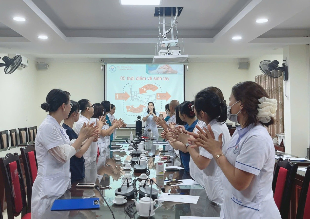 Chia sẻ tại buổi tập huấn, CN. Trần Thị Hà – Phụ trách khoa Kiểm soát nhiễm khuẩn cho biết: Nhiễm khuẩn Bệnh viện là một trong những nguyên nhân hàng đầu đe dọa sự an toàn đến người bệnh, làm tăng thời gian nằm viện, tăng chi phí điều trị và tăng tỷ lệ tử vong. Nhiễm khuẩn Bệnh viện có thể được ngăn ngừa nếu áp dụng đồng bộ các biện pháp kiểm soát nhiễm khuẩn, trong đó vệ sinh tay luôn được coi là biện pháp đơn giản và hiệu quả nhất để giảm nguy cơ nhiễm khuẩn, đảm bảo an toàn cho người bệnh và nhân viên y tế.